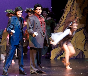 Photo credi: Sandy Napel 10/26/12; caption: (L-R) Gray Perrone (sophomore) as Antonio and Lisette Espinoza (junior) as Sebastian brandishing swords, and Maddie Rostami (junior) as Ariel leaping about with flower nymphs behind.
